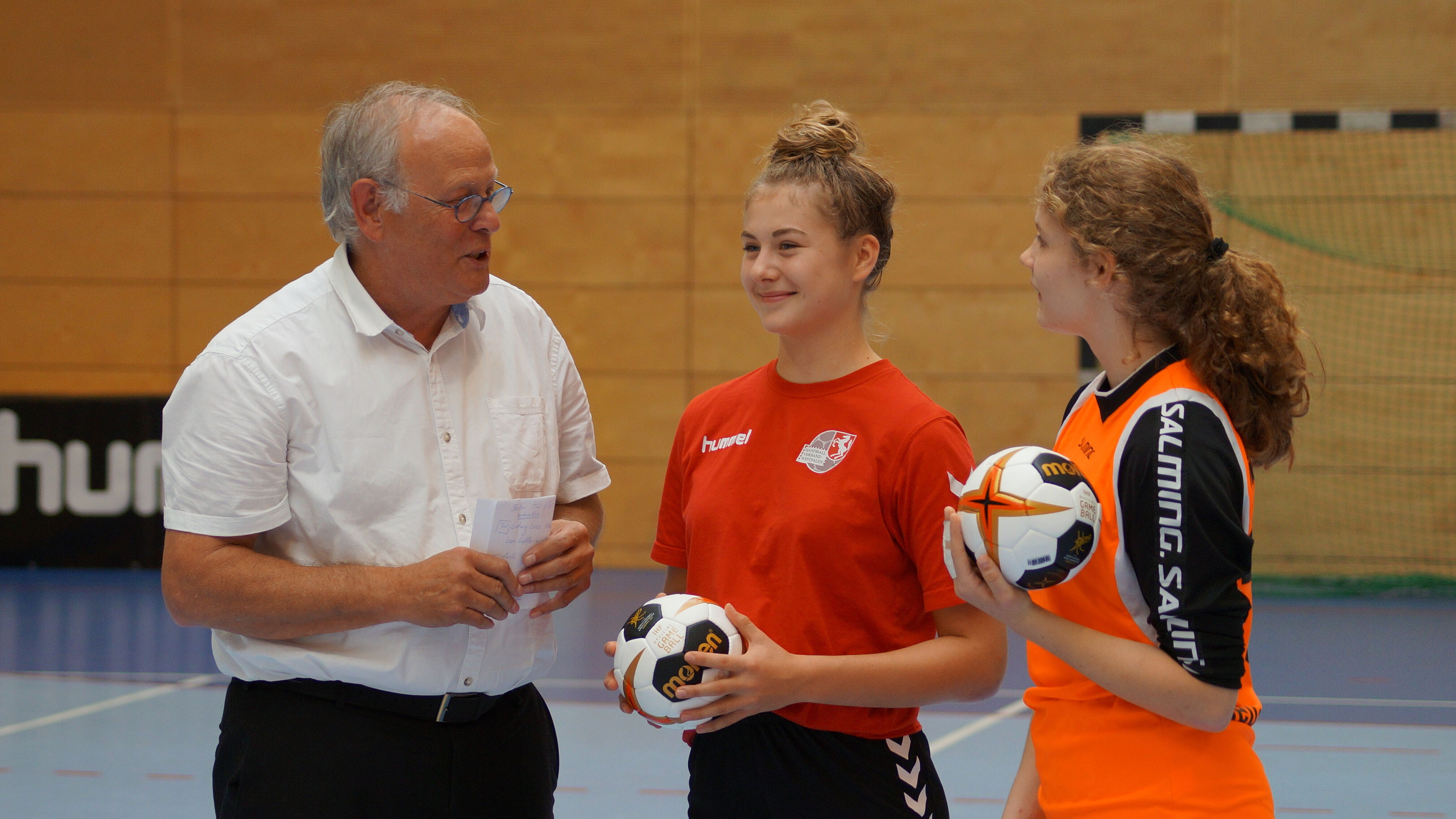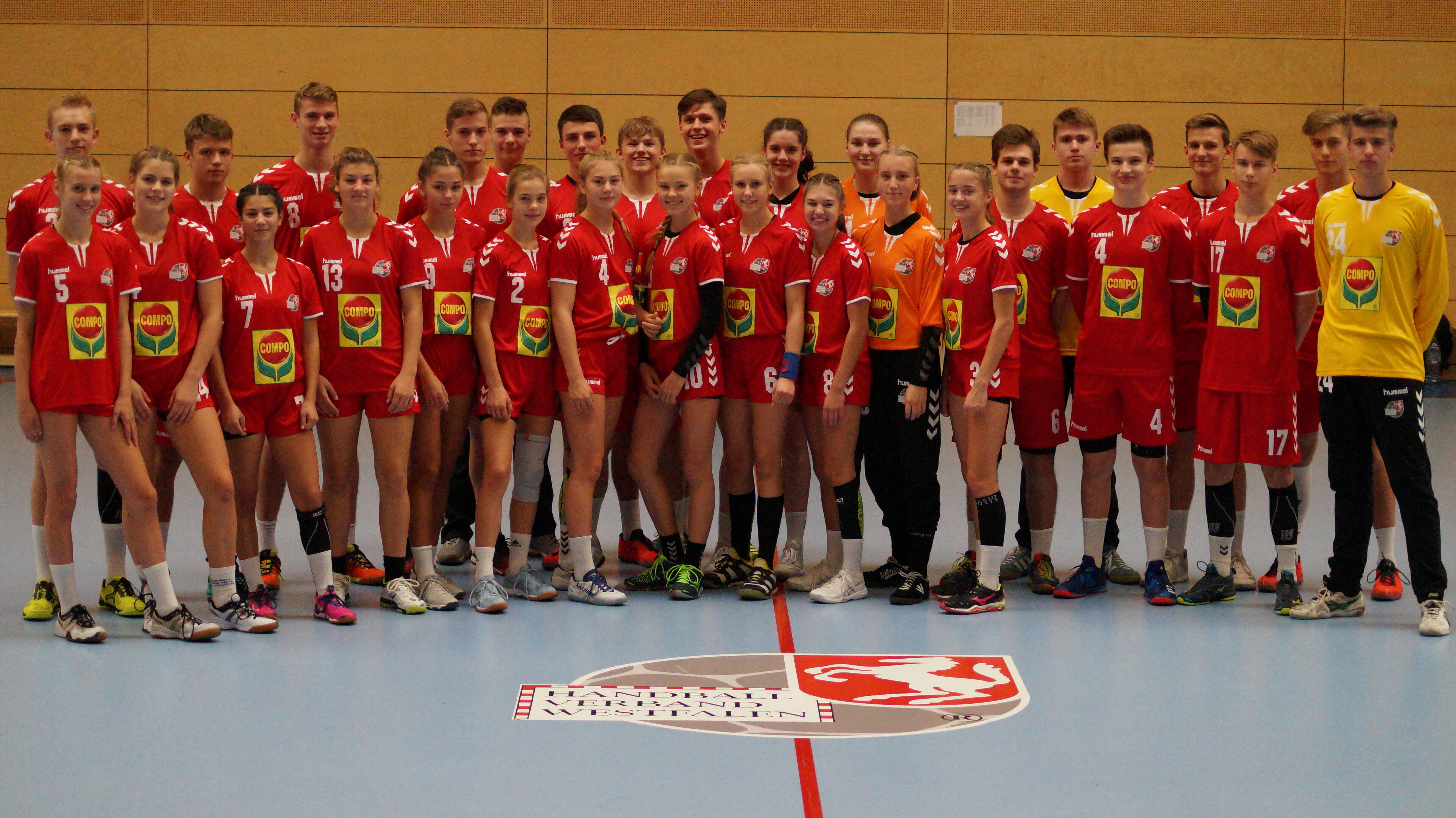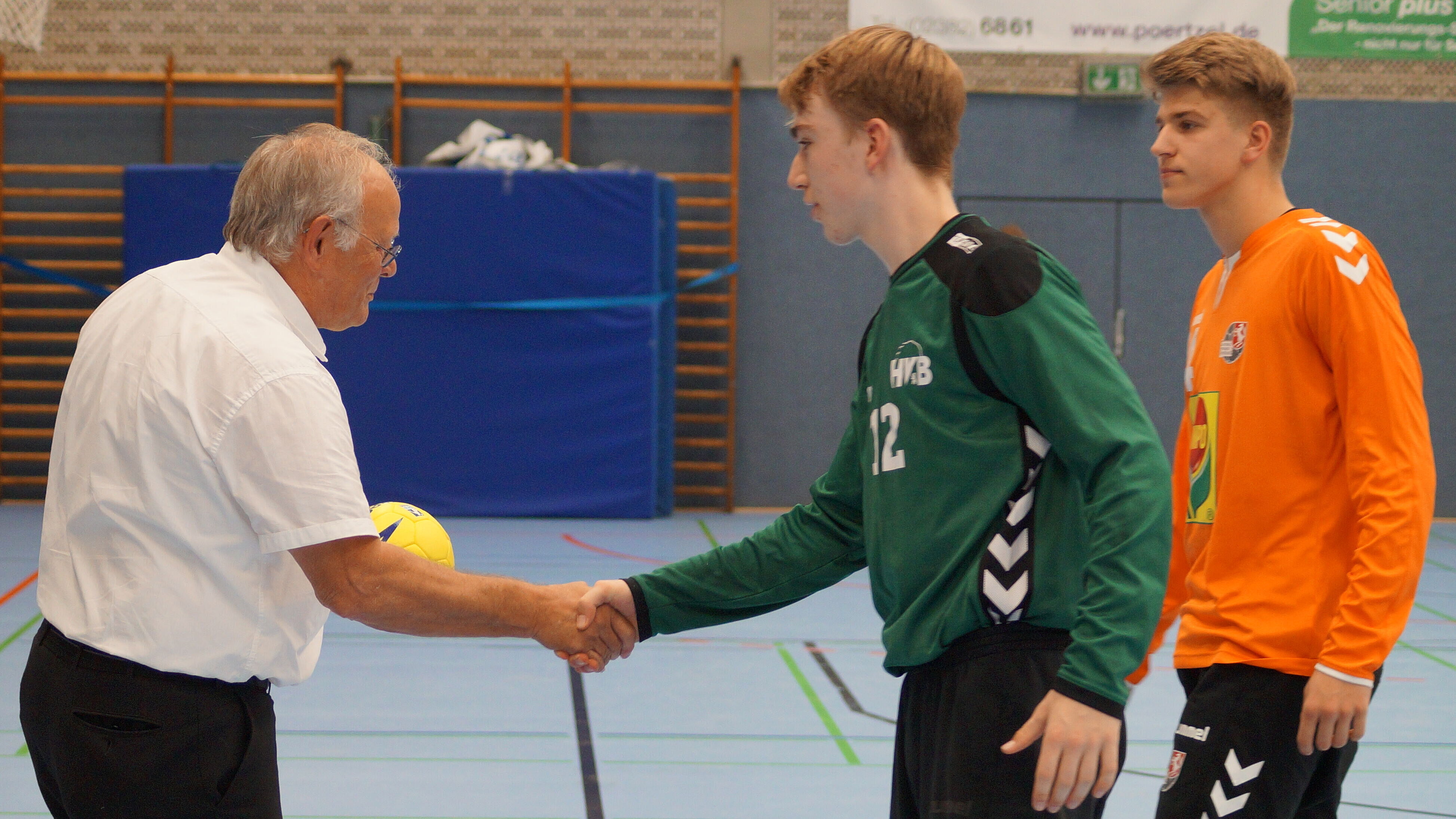 Doch bevor der Spielbetrieb in den beiden Hallen starten konnte, zeigten der Geschäftsführer der Firma COMPO Stephan Engster und der Präsident des HV Westfalen Wilhelm Barnhusen die neuen Trikots, in denen die Westfalenauswahl aufgelaufen ist, als Symbol für die neue Zusammenarbeit.