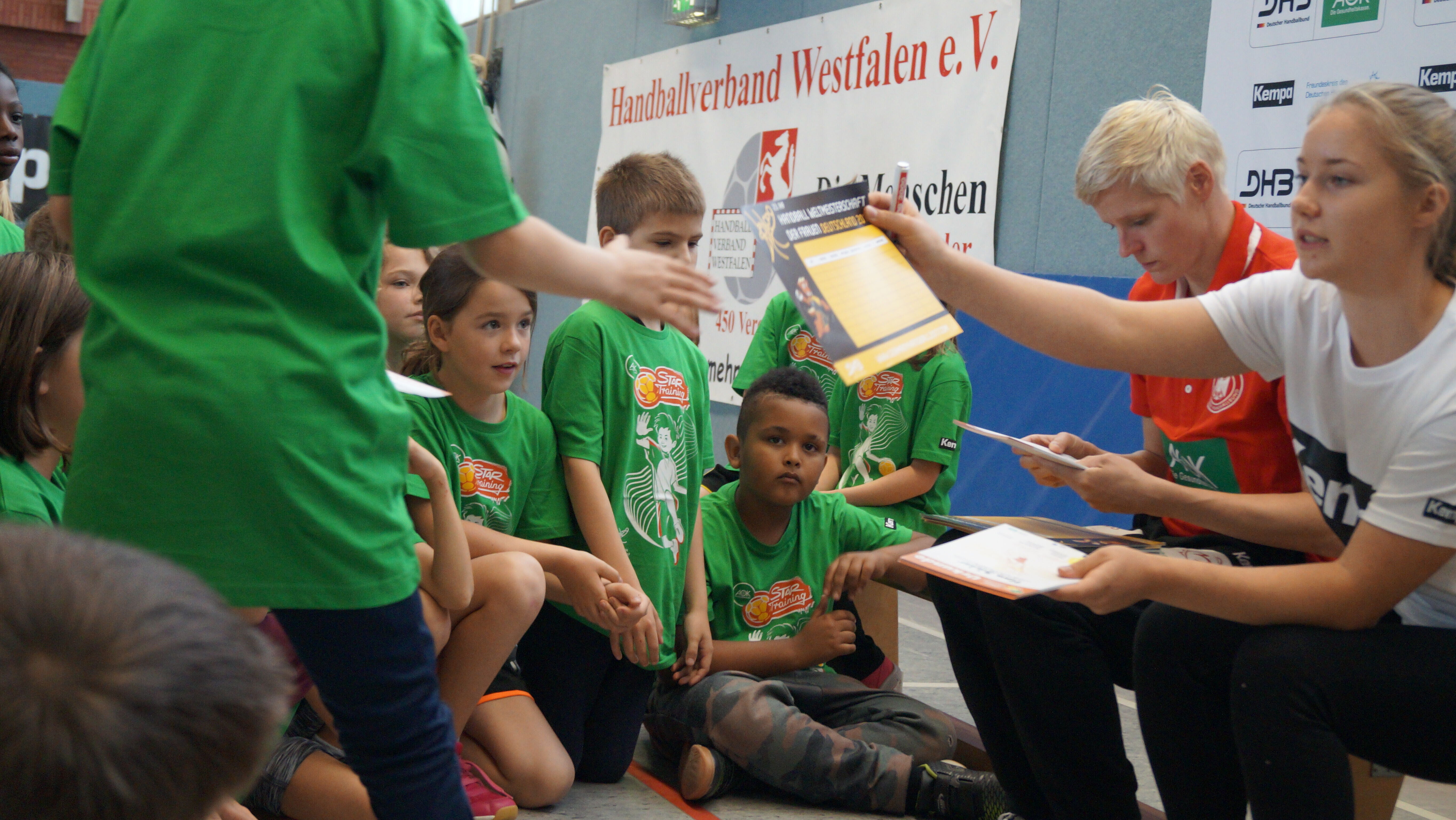 Abschließend zu dem abwechslungsreichen Handballprogramm, stand dann noch die Fragerunde auf dem Plan, wo die Kinder die Gelegenheit bekamen, die Stars alles zu fragen, was ihnen in den Sinn kam. Natürlich wurden nach der Fragerunde auch Autogramm- und Fotowünsche der Kinder erfüllt und jedes Kind bekam für die Teilnahme am Handball-Schnupperkurs eine Urkunde.