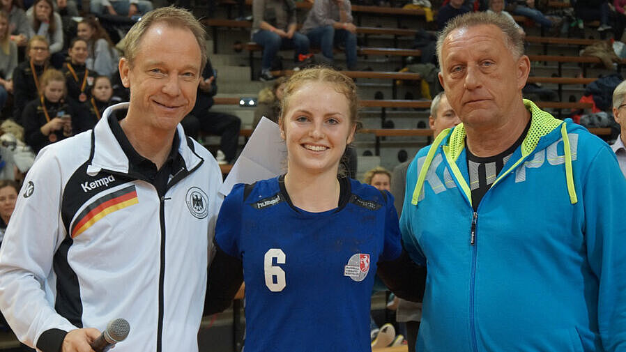 Besonders gefreut haben sich alle für Leonie Kockel, die sowohl ins All-Star Team gewählt worden ist als auch zusätzlich noch zur wertvollsten Spielerinn des Turniers gekürt wurde. DHB-Chef-Bundestrainer-Nachwuchs weiblich Maik Nowak und Frauen-Bundestrainer Michael Biegler gratulierten Leonie persönlich zu dieser überragenden Leistung.