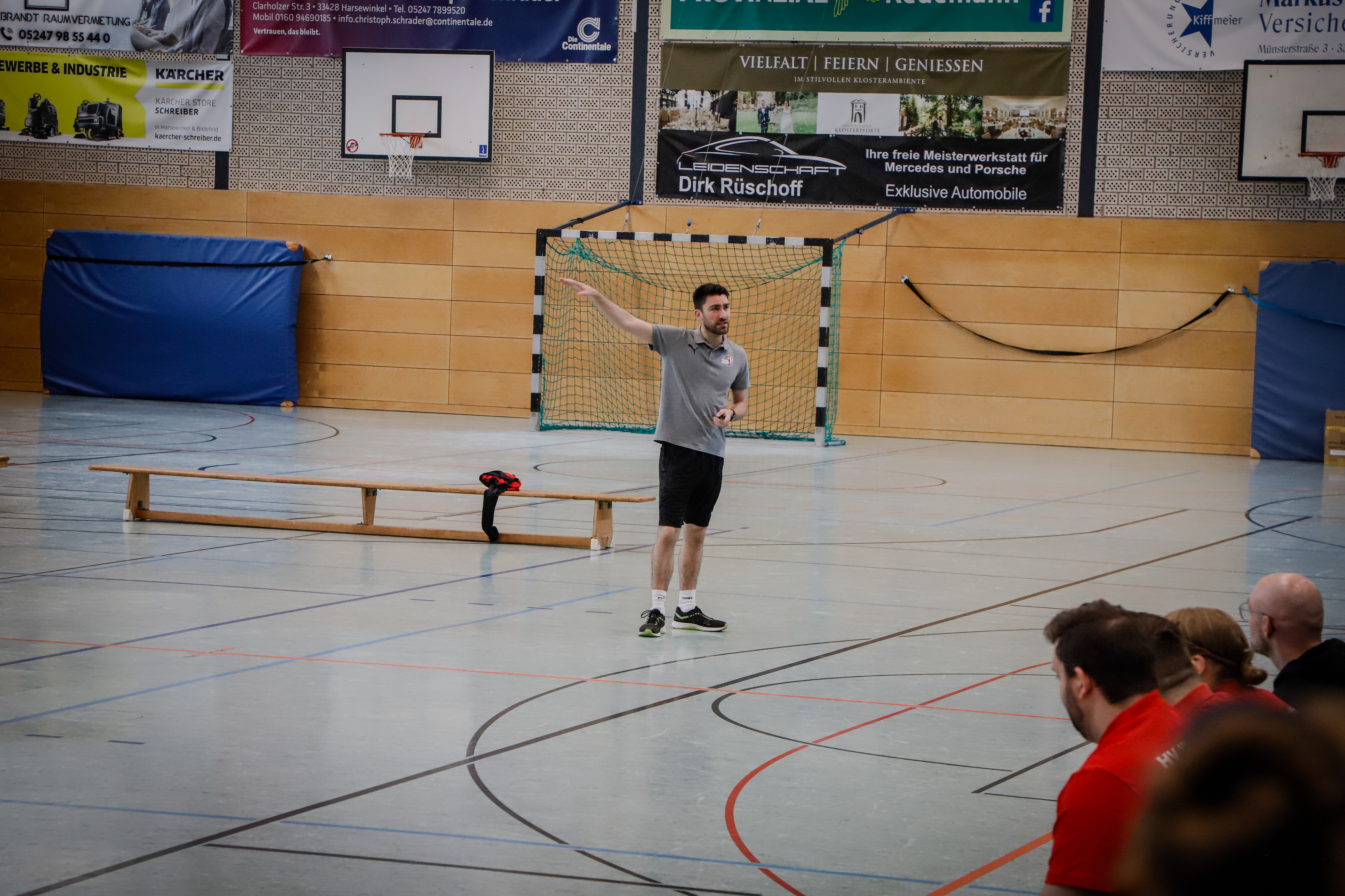 In den Workshops wurden verschiedene Schwerpunkte behandelt: Tobias Salewsky stellte Möglichkeiten für ein kindgerechtes Athletiktraining vor und präsentierte vielfältige Übungsformen zur Förderung der motorischen Grundlagen. Fabian Beckmann beschäftigte sich mit dem Thema Wurftechnik und zeigte anhand einer Jugend-Demomannschaft der TSG Harsewinkel, wie technische Inhalte spielerisch und verständlich vermittelt werden können. Sabrina Obst gab Einblicke in das Torwartspiel im Kinderhandball und erklärte, wie Torhütertraining methodisch sinnvoll und altersgerecht in das Mannschaftstraining eingebunden werden kann. Marco Grgic thematisierte Parteiballspiele als Trainingsform, mit der sich Raumaufteilung und Gruppengrößen flexibel steuern lassen. Auch hier unterstützten junge Spielerinnen und Spieler der TSG Harsewinkel die praktische Umsetzung.